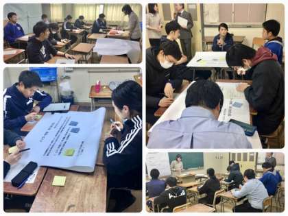 最初は、3つのグループに分かれて意見交流し、後半はそれぞれの教員が意見を発表しあい研修を深めました。淀中学校の若手教員は、ベテラン・中堅教員に勝るとも劣らない人材です。主体的で協働的な深い学びが展開されました。