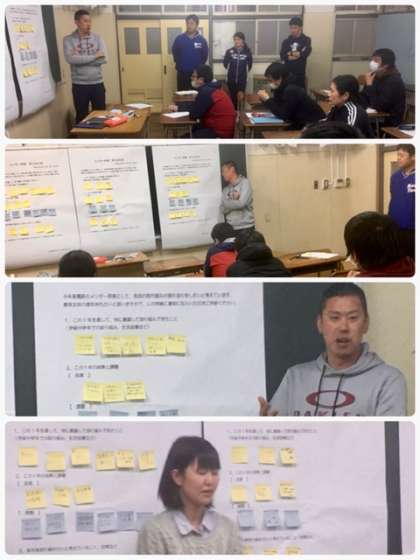 教員の発表に続いて、紀井先生からご指導をいただきました。平尾誠二さんの人を叱る時の4つの心得や松下幸之助さん本田宗一郎さん志村ケンさんの言葉を引用してお話しくださり、次年度に向けて示唆を戴きました。