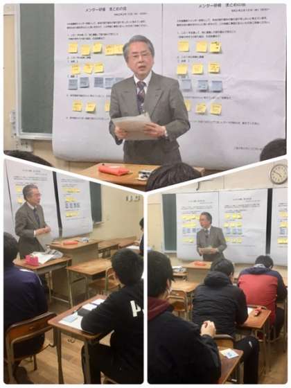 本日、午後4時より大阪市教育センター教育指導員の紀井正澄先生をお迎えして、メンター研修会(若手教員による研修会)を開催しました。淀中学校には、若手教員がたくさん在籍しています。メンター(若手教員のリーダー)の細見先生が、一年を振り返って取り組んだことや、その成果と課題を振り返り次年度に向けて目標や取り組みたいことを話し合う研修会を開いてくださいました。