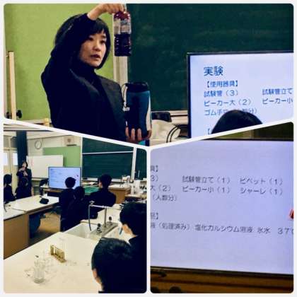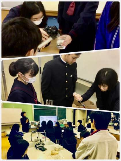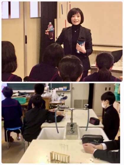 理科の出前授業です。講師は好文学園女子高等学校の鷹取真穂先生です。豚の血を使っての実験に生徒たちは、最初びっくりしていました。