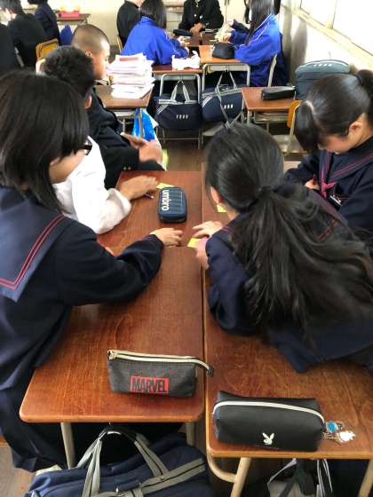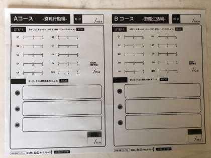班に分かれ、DVDに沿って避難行動や避難生活について3択クイズを解き、その後グループで考えた答えをもとに話し合いを行いました。