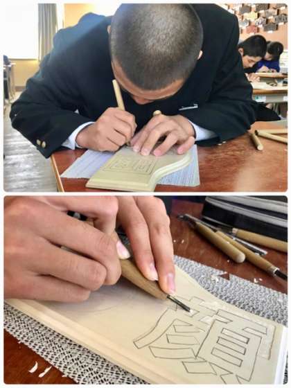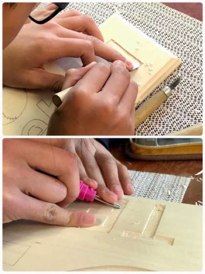 持ち手と逆の手のを歯に添えて指先で刃先をコントロールをする事で彫刻の正確さを高めケガを予防します。