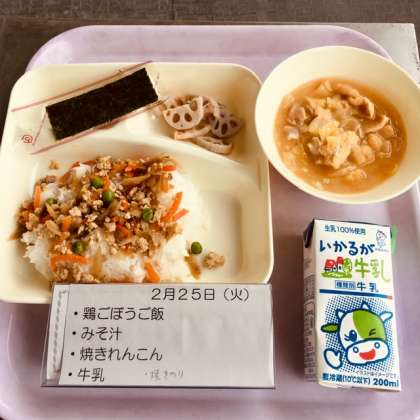 今日の献立は、鶏ゴボウご飯、焼き海苔、焼きレンコン、お味噌汁、牛乳です。