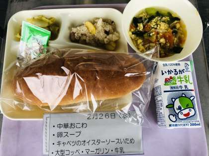 本日の給食は、中華おこわ、卵スープ、キャベツのオイスターソースいため、大型コッペパン、マーガリン、牛乳です。いただきます。