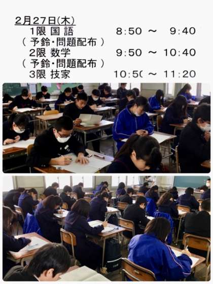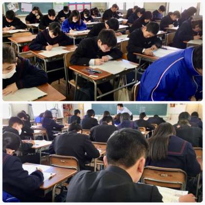 1・2年生は、学年末テストの2日目を迎えました。今年1年間の学習の成果をしっかり発揮してほしいです。
