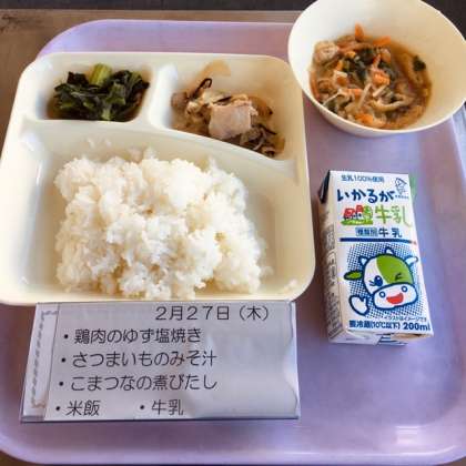 本日の献立は、鶏肉の柚子塩焼、小松菜の煮浸、サツマイモのお味噌汁、米飯、牛乳です。