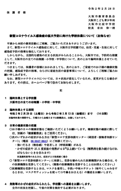 昨日より、新聞・テレビ・インターネットで大阪市立中学校が、新型コロナウイルス感染症の拡大予防に向けて休校となると報道がありました。確実な情報をお伝えすることができなくご心配をおかけいたしました。