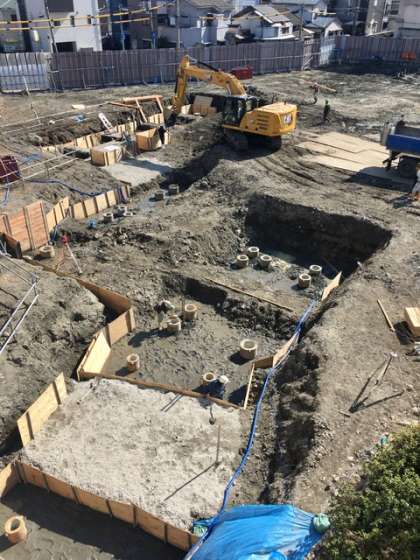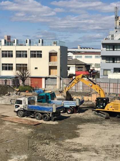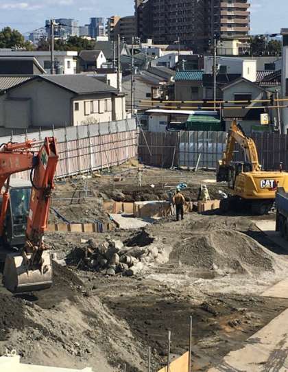 さて、久しぶりに校舎建て替え工事の様子をお知らせします。先月までの杭打ち工事を終え今週からは、新校舎の基礎工事のための掘削工事が始まりました。丸く見えるのが杭です。大きな校舎が建つので、見合った基礎を作るために穴を掘っています。