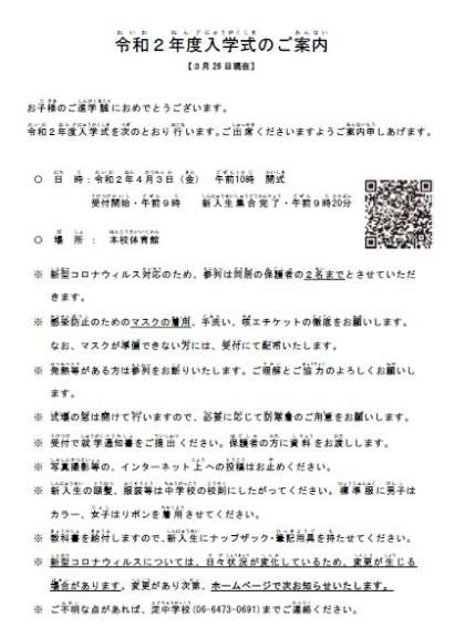 令和2年度入学式案内 (3月26日 更新)