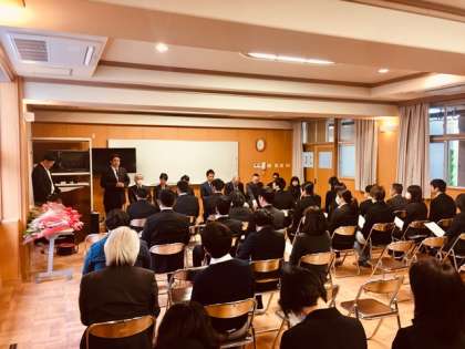 例年は、事前に離任式のご案内をして生徒、卒業生、保護者、地域のご来賓の皆様にも、離任式にお越しくださっていましたが、今年度は新型コロナウィルス感染症の拡大防止のためご案内をさしあげる事を控えさせていただきました。予防対策をご理解いただきますようお願いいたします。