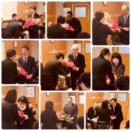 有田伸一朗校長先生(北区・大淀中学校へ)、岡慎太郎先生(ご退職)、江田晃子先生(福島区・八阪中学校)、中森敬子先生(平野区・平野北中学校)、前田恵汰先生(芦屋市立山手中学校)、酒井康正先生(大正区・大正東中学校)、吉澤典子先生(住吉区・大和川中学校)、稲益将人さん(校園営繕園芸事務所)、鈴木久美先生(ご退職)、Tenesha Chin先生(ご退職)に、一言ずつお言葉をいただき花束を贈らさていただきました。