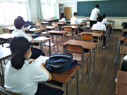 新クラス発表後、感染拡大防止のため分散して教室に入りました。