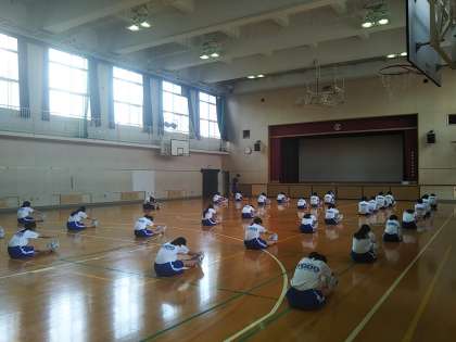 体育の授業時にはマスクの着用は必要ないですが、感染リスクを避けるため、間隔を確保しておこなっています。