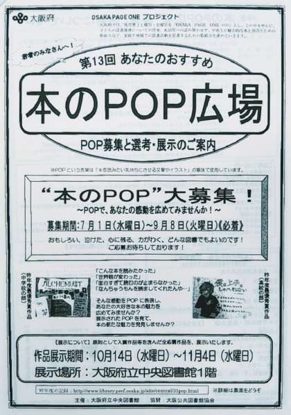 大阪府立中央図書館では、あなたのオススメ本をPOP(本を読みたい気持ちにさせる文章やイラスト)に表現したものを募集しています。