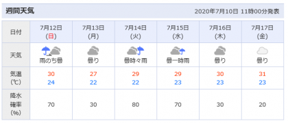 気象庁の予想では、向こう一週間の近畿地方は、前線や湿った空気の影響で雲が広がりやすく、雨の降る日が多く、11日と12日は、前線の活動の程度によっては大雨となるおそれがあります。また、14日頃は、前線の活動の程度によっては大雨となる見込みのようです。
