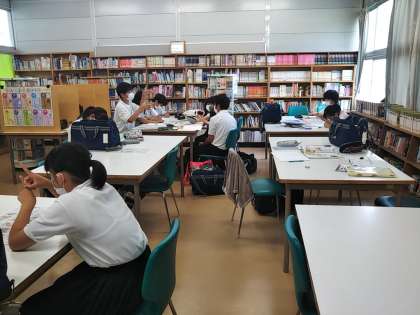 放課後の図書館開放にたくさんの生徒たちが来ています。テスト勉強をしている人、本を読みに来ている人など目的はいろいろ。
