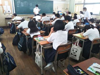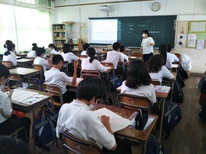 1年生の授業風景です。技術の授業では木材の勉強で、普段はあまり気にすることのない木の性質について学んでいました。