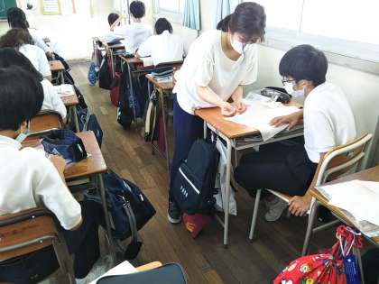 また、隣のクラスは家庭科の授業で、刺しゅうの実習がおこなわれていました。ランチョンマットを作っているようです。完成が楽しみですね。