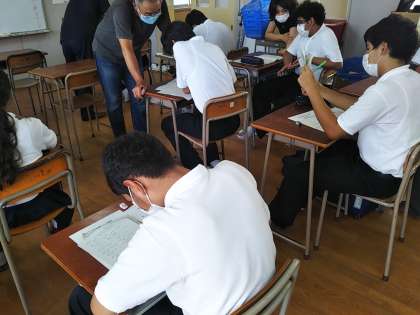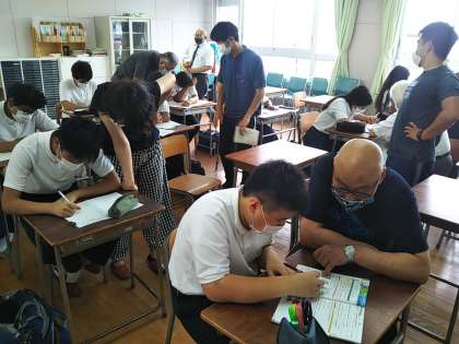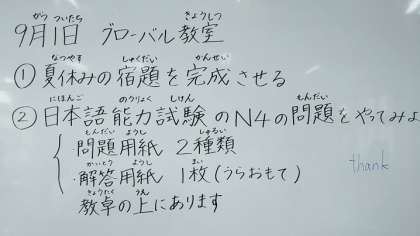 さっきまで降っていた雨があがり、また陽が差してきた放課後、2学期最初のグローバル教室が開かれました。本日の学習に集まった生徒は10人でした。とても熱心に集中して学習していました。なかには、日本語能力試験の問題をがんばって解いている人もいました。各自がそれぞれの目標に向かって努力し、それをボランティアの皆さんも応援してくれています。がんばれー!