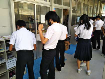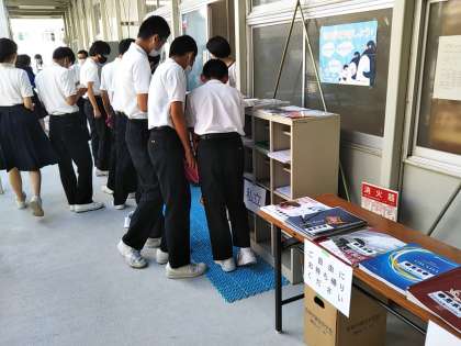 休み時間になると3年生の生徒を中心に、関心のある学校のパンフレットを探しに来ていました。進路選択の参考にしてほしいと思います。持って帰ることもできますよー。