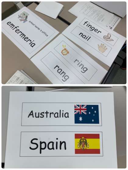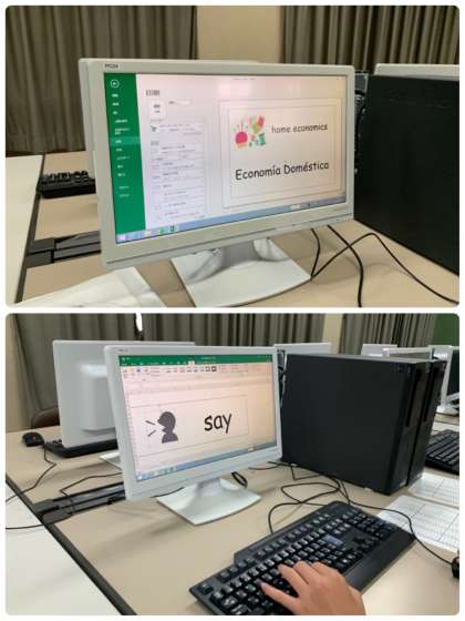 英語部は今、新しい校舎の階段に貼る英単語カードを作成しています。教科、体のパーツ、色、国の名前、よく使う動詞などを、パソコンを使って絵と組み合わせて、編集しています。単語と絵を組み合わせることで、その単語がイメージしやすくなると思いませんか?また本校には外国にルーツを持つ生徒も多く、特別教室には英語とスペイン語で書かれたカードを貼ろうと考えています。お楽しみに!