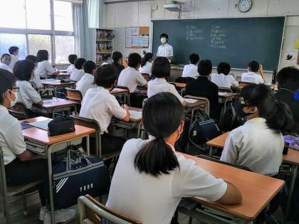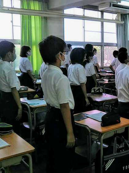 朝の学活時、教室でのあいさつの場面です。