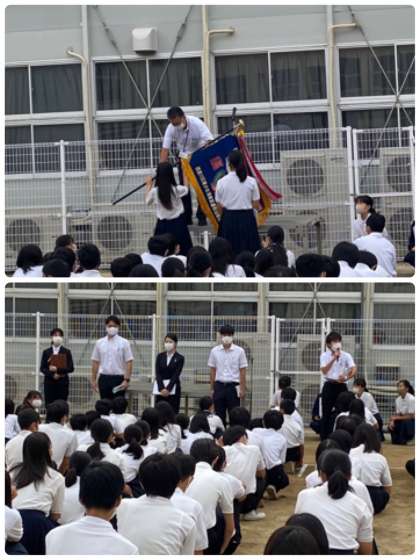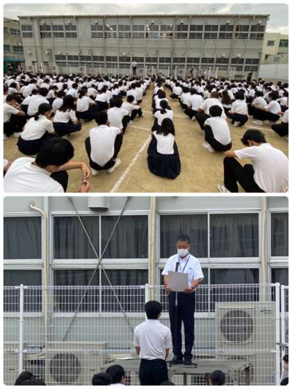 久しぶりに全校集会を運動場で行いました。熱中症の心配とコロナウイルス対策として放送での集会でしたが、今月から再開しました。全校生徒の前で陸上部、淀心魂の表彰を行いました。また本日より教育実習がスタートします。今年は4名の実習生が3週間、たくさんの活動を通して教育への意欲や情熱をわきたせてほしいとおもいます。