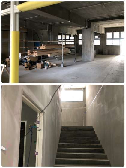 新校舎が完成に近づいてきました。5階までの型枠も完成しています。特別に1階の工事の様子を見学させていただきました。1つ1つの部屋の内装工事も進められています。第1期工事は令和3年3月に完成予定です。