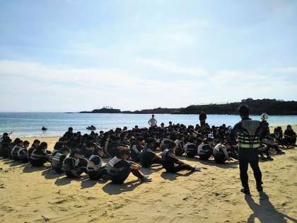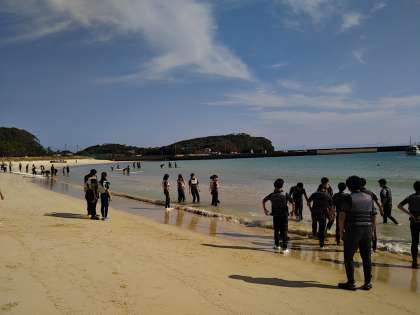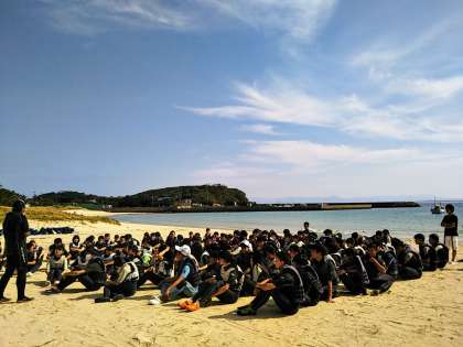 天気は最高。ビーチは夏のような暑さです。マリンスーツに着替え、クラス写真を撮影したらスタートです。