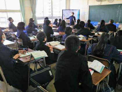 その当時の中国の様子がわかるように大型テレビを使いながら句を解説。生徒も当時の情景を頭に浮かべながら、いろんな意見を発表し、勉強を進めていました。