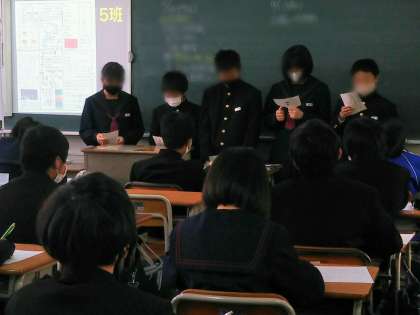 そこで、1年生は身近にいる仲間のルーツの国について班ごとに調べる学習をおこない、今日の1時間目にその調べたことをクラス毎に発表しました。