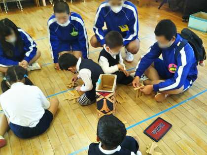 元気いっぱいの幼稚園児たちと、ゲームやおにごっこ遊びなどをして交流します。最初は緊張していた3年生たちでしたが、すぐに子どもたちと仲良くなって遊んでいました。生徒の胸には、手作りのアップリケの名札をつけています。