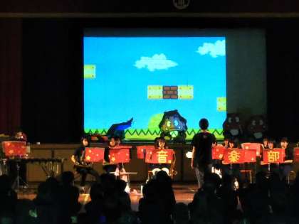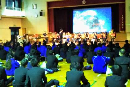 全校生徒を2分割。2回公演とし、体育館での演奏は40分までという制限のもと実施しました。そのような中でも音楽部の演奏は素晴らしく、アンコールも出るなど大変盛り上がりました。