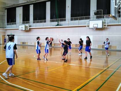 午前中の体育館では、男子と女子のバスケットボール部が全面を使って交互に練習をしていました。がんばっています!