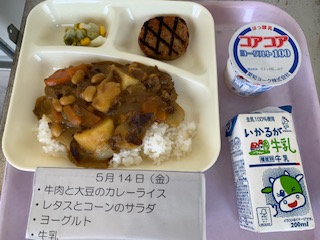牛肉と大豆のカレーライス・レタスとコーンのサラダ・ヨーグルト・牛乳