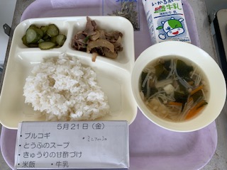 プルコギ・とうふのスープ・きゅうりの甘酢づけ・米飯・牛乳・ミニフィッシュ