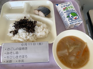 さごしの塩焼き・みそ汁・牛ひじきそぼろ・ごはん・牛乳