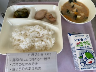 鶏肉のしょうゆバター焼き・こまつなのみそ汁・きゅうりのあえもの・ごはん・牛乳