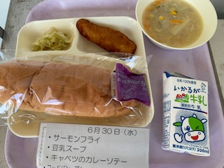 サーモンフライ・豆乳スープ・キャベツのソテー・パン・牛乳・ブルーベリージャム