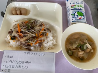 牛丼・とうがんのみそ汁・白花豆の煮もの・ごはん・牛乳