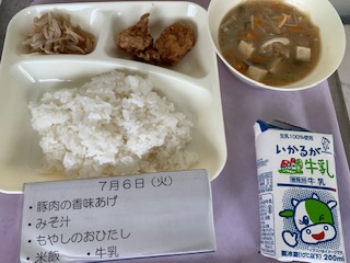 豚肉の香味あげ・みそ汁・もやしのおひたし・ごはん・牛乳