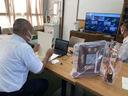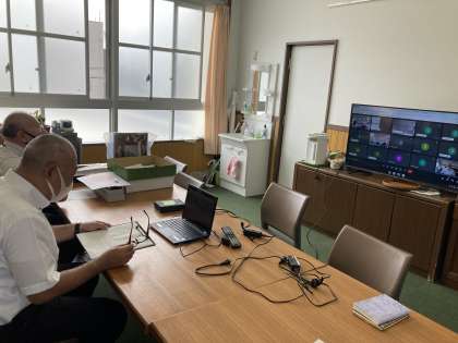 緊急事態宣言期間中の始業式であるため、体育館や運動場を避け、校内でのオンライン始業式を行いました。双方向通信にすると画像がスムーズに動かない面もありましたが、始業式を終えることができました。