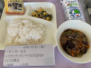 ごはん・牛乳・マーボーなす・ツナとチンゲンサイのいためもの・いり黒豆