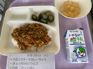 ごはん・牛乳・大豆入りキーマカレーライス[米粉]・きゅうりのピクルス・白桃(カット缶)