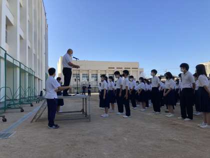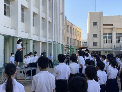これまでの暑さも、朝は幾分和らいできました。暑い時期には、放送やオンラインでの全校集会を行ってきましたが、対面で集会を開くことができました。