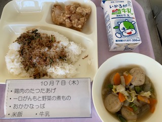 ごはん・牛乳・鶏肉のたつたあげ・一口がんもと野菜の煮もの・おかかなっ葉