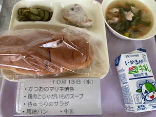 パン・牛乳・かつおのマリネ焼き・鶏肉とじゃがいものスープ・きゅりのサラダ