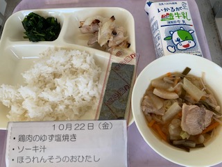 ご飯・牛乳・鶏肉のゆず塩焼き・ソーキ汁・ほうれんそうのおしたし・焼きのり