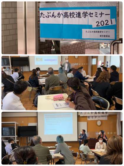 24日(日)淀中学校多目的室で「たぶんか高校進学セミナー2021」を開催し、多くの保護者や生徒にご参加いただき、ありがとうございました。スペイン語、フィリピン語、ポルトガル語、ネパール語、英語、日本語、ベトナム語の7か国語の通訳の方の協力により日本の高等学校の入試制度や授業料等幅広い説明が行われました。また、先輩による体験談などが行われました。その後、個別の相談を行うなど充実したものとなりました。