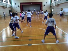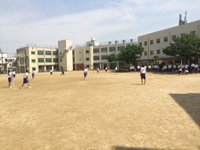おこなっています。男子のドッジボールはボール2つ、かなりハードなゲームです。グランドでは女子がキックベースボールをやってます。クラスメイトを思い切り声を出して応援しています。男女ごとゲームが終わると、学級全員参加のリレーです。